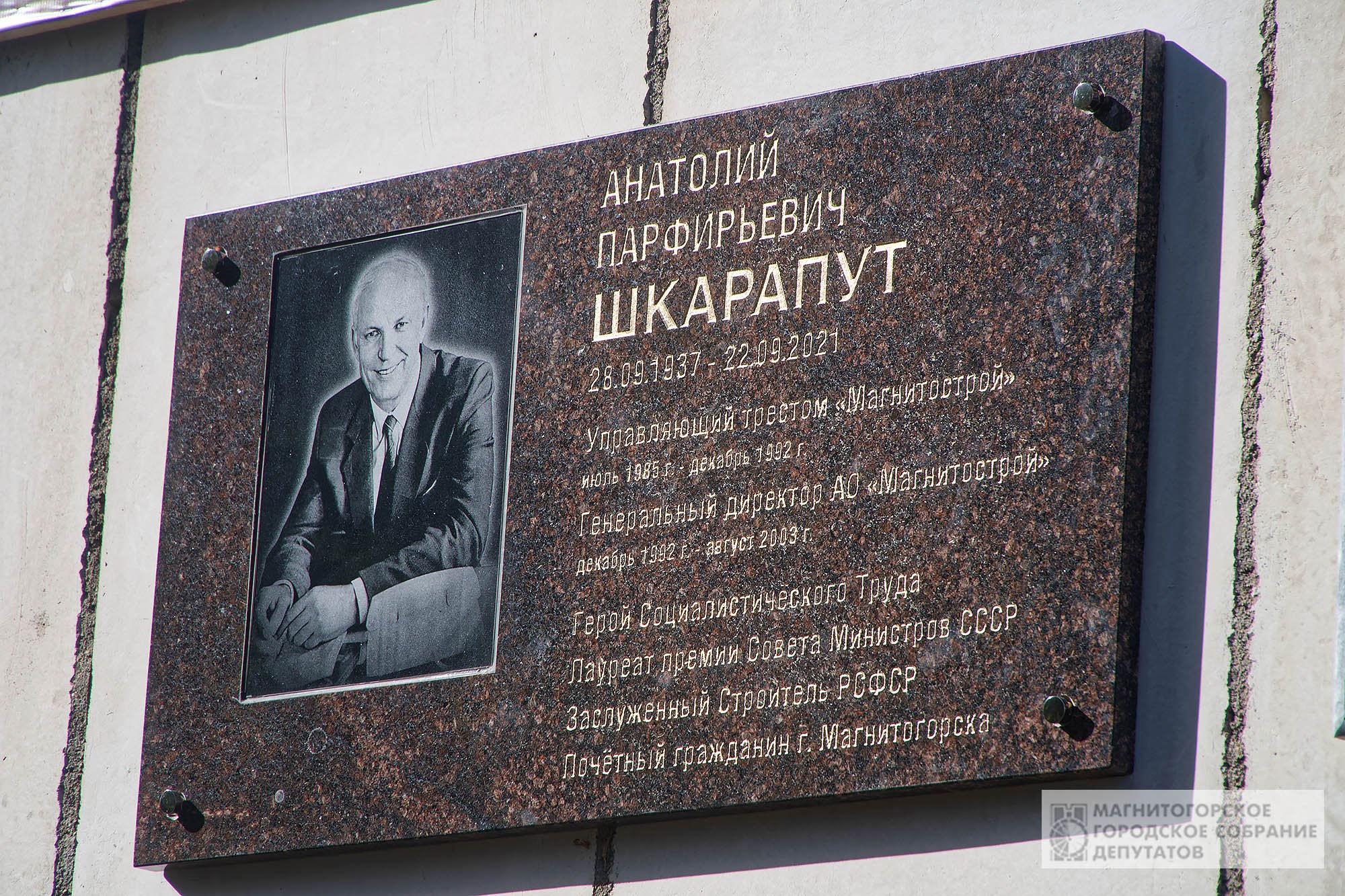 На здании треста «Магнитострой» установили мемориальную доску Почётному гражданину Магнитогорска, известному строителю Магнитки Анатолию Парфирьевичу Шкарапуту.