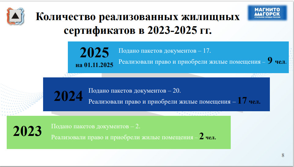 В адрес Министерства социальных отношений Челябинской области за период с 2023–2025 годы направлено 39 пакетов документов для принятия решения о предоставлении выплаты на приобретение в собственность благоустроенного жилого помещения.