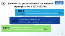 «В рамках выделенных субвенций в 2023 году было приобретено 54 квартиры, в 2024 - 32 жилых помещения, из них 21 жилое помещение путём участия в долевом строительстве со сроком передачи июнь и декабрь 2025 года. В июне 2025 года жилые помещения были приняты и переданы по договорам специализированного найма детям-сиротам. В первую очередь квартиры были предоставлены участникам СВО. В 2025 году приобретено 118 жилых помещения путём участия в долевом строительстве со сроком передачи объектов - декабрь 2025 года», - рассказала Елена Геннадьевна.