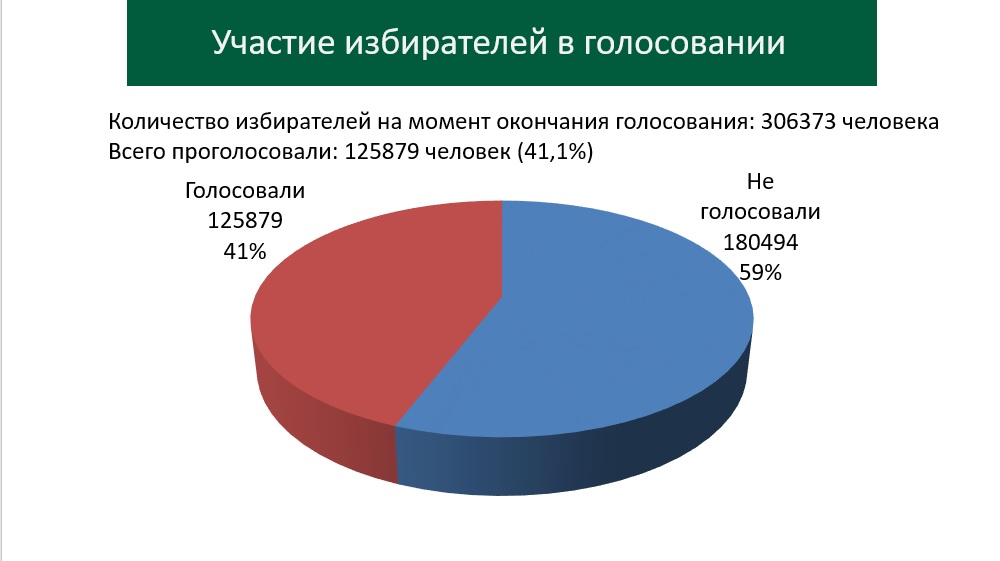 Председатель избирательной комиссии озвучил итоги: «По состоянию на 1 июля число избирателей в Магнитогорске составляло 308160 человек. Из Орджоникидзевского района – 50%, из Правобережного – 27%, Ленинского - 23%. На выборах проголосовало 125879 человек, что составило 41,1% от числа принявших участие в голосовании». Для сравнения: явка на выборах в 2020 году составляла 32%.
