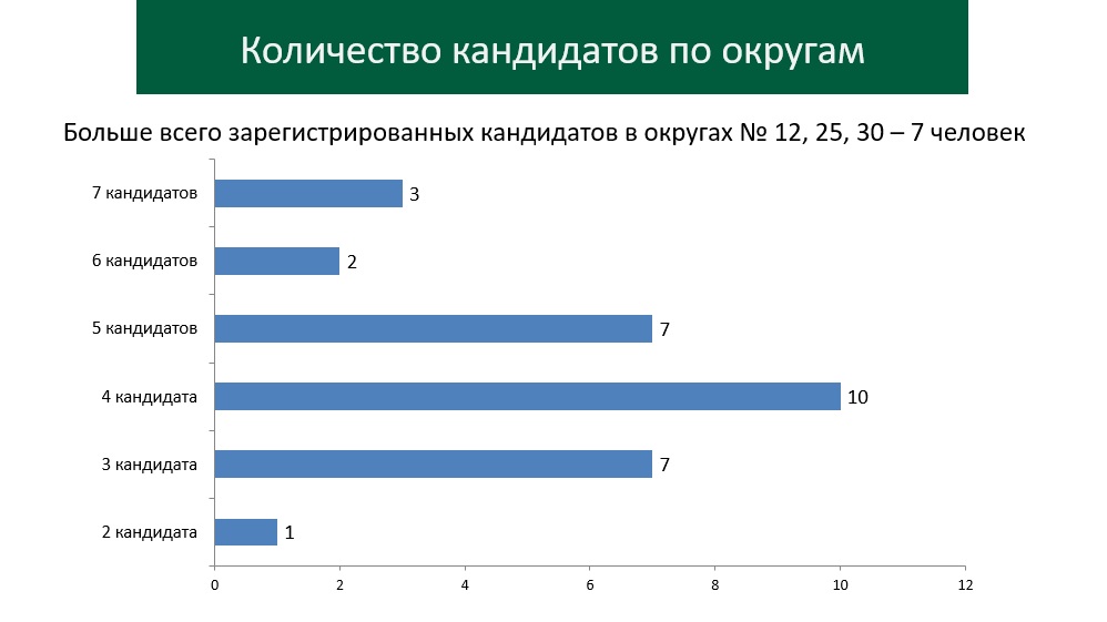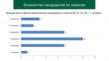 Количество кандидатов по округам составило от 2 человек – в одном округе до 7 человек – в трёх округах. По 3 кандидата было в семи округах, по 4 кандидата – в десяти округах, по 5 кандидатов – в семи округах, по 6 кандидатов – в двух округах.