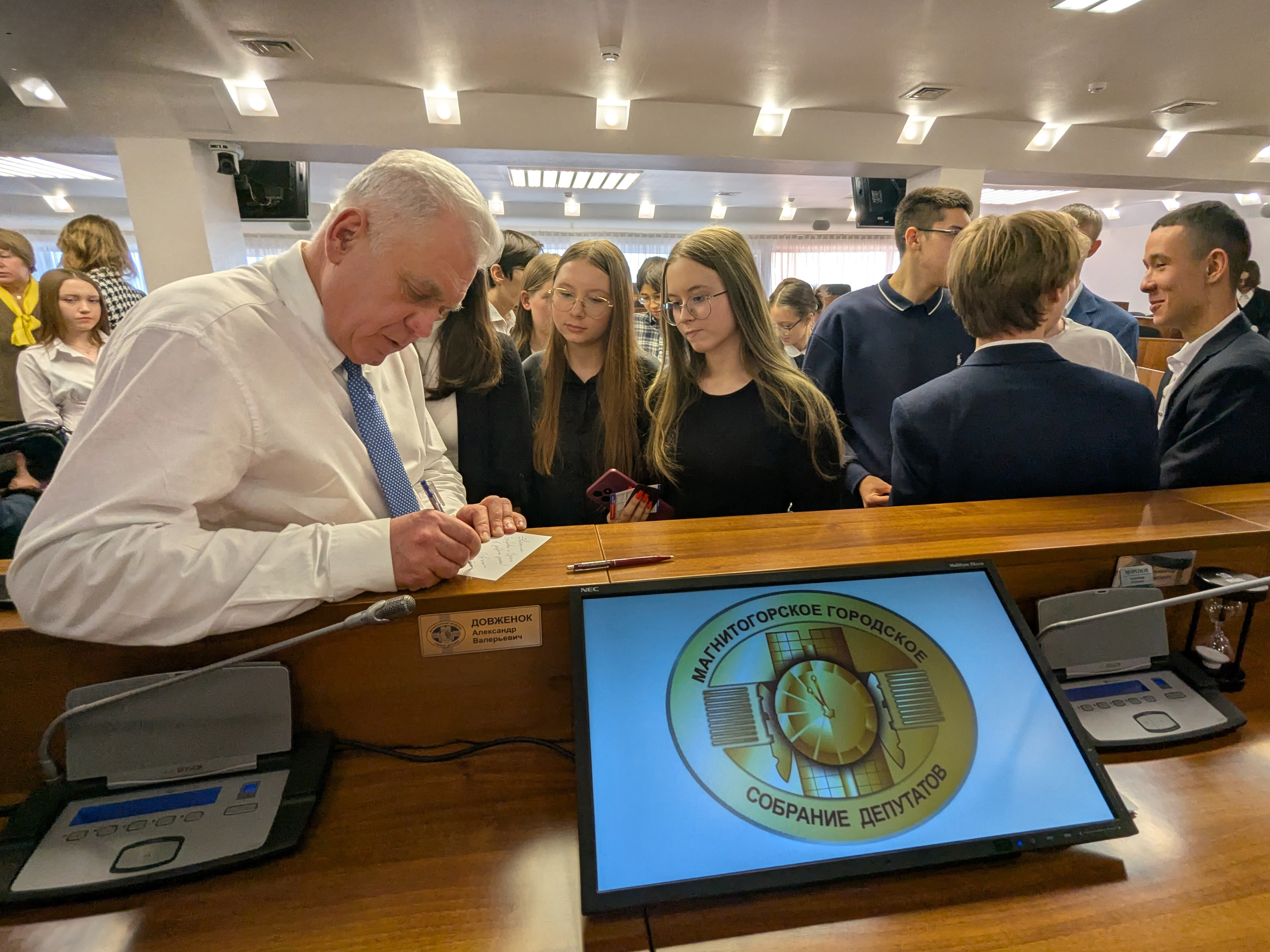 Именно в зале заседаний и состоялась встреча учащихся с председателем МГСД Александром Морозовым. О родном городе и его официальных символах: гербе, флаге и гимне, - Александр Олегович всегда рассказывает с большой любовью. И тем, что гимном Магнитогорска была утверждена песня Александры Пахмутовой и Николая Добронравова «Магнитка, Александр Морозов особо дорожит. Про гимн председатель и вспомнил, когда отвечал на вопрос лицеистов о депутатском решении, которым гордится.
