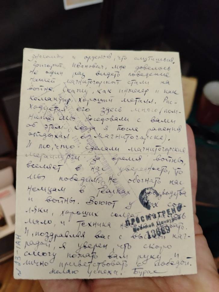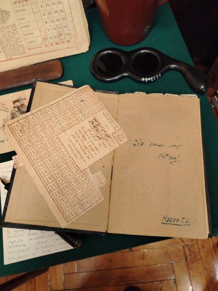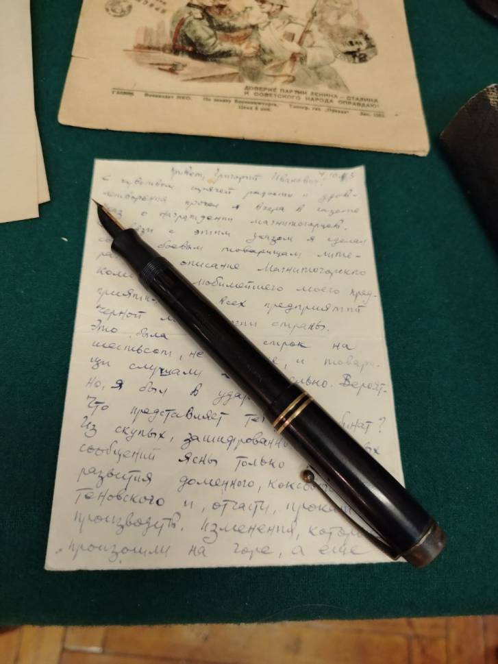 На столе – чернильная ручка, справка эвакуированного, продуктовые карточки, настольный календарь за 1944 год, письмо, написанное командиром Красной Армии по фамилии Бурос директору ММК Григорию Носову. Судьбу этого человека установить до конца пока не удалось, но известно, что он инженер-металлург по образованию и имел связь с Магниткой. Бурос пишет, что «…хорош магнитогорский металл…, много его на фронте тратится». Один из самых интересных экспонатов – записная книжка директора ММК Григория Носова, датированная июлем 1945 года», - рассказывает руководитель музея ПАО «ММК» Надежда Халитова.