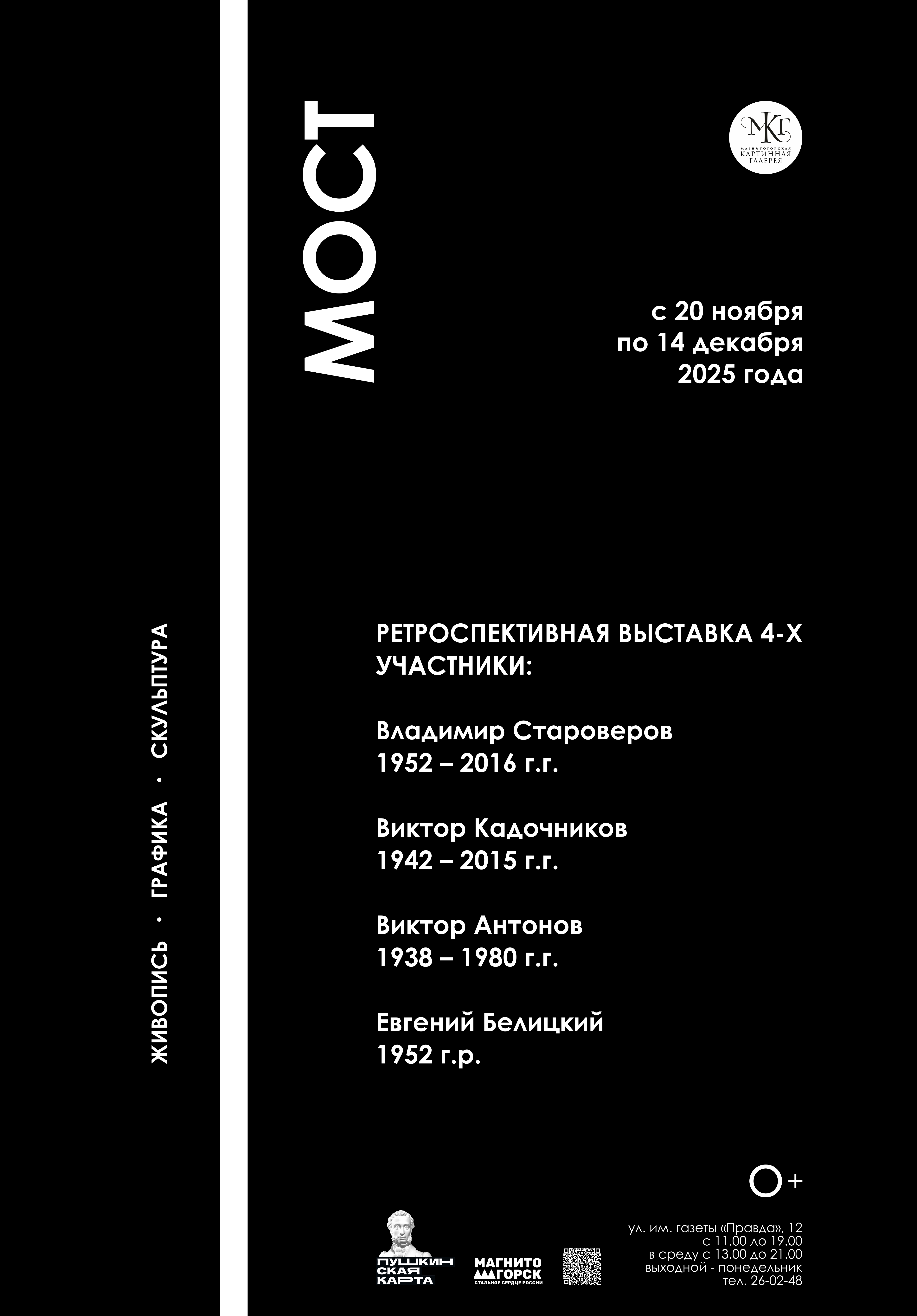 Четыре художника – что их объединяет? Найти ответ на этот вопрос картинная галерея предлагает посетителям выставки «Мост». Из 4-х авторов, чьи работы собраны в экспозицию, в живых только один. Это Евгений Белицкий – выпускник ХГФ МГПИ, бывший руководитель изостудии ММК. Себе в компанию он взял Виктора Антонова (1938-1980) – андеграудного художника и скульптора второй половины двадцатого века, глубокого и элитарного, ушедшего из жизни непонятым и непринятым.