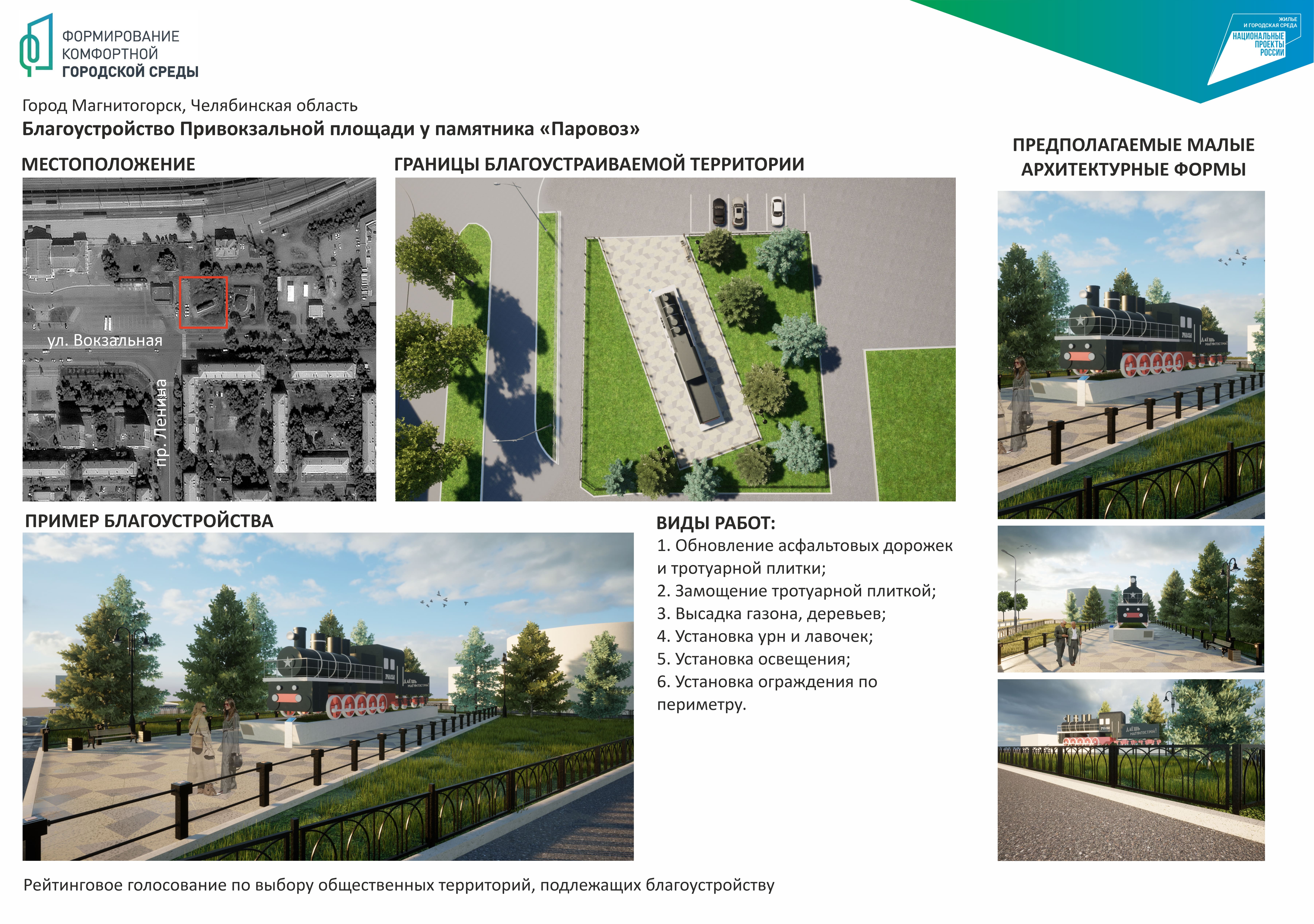 5) Благоустройство Привокзальной площади у памятника «Паровоз» (в Ленинском районе у автовокзала);