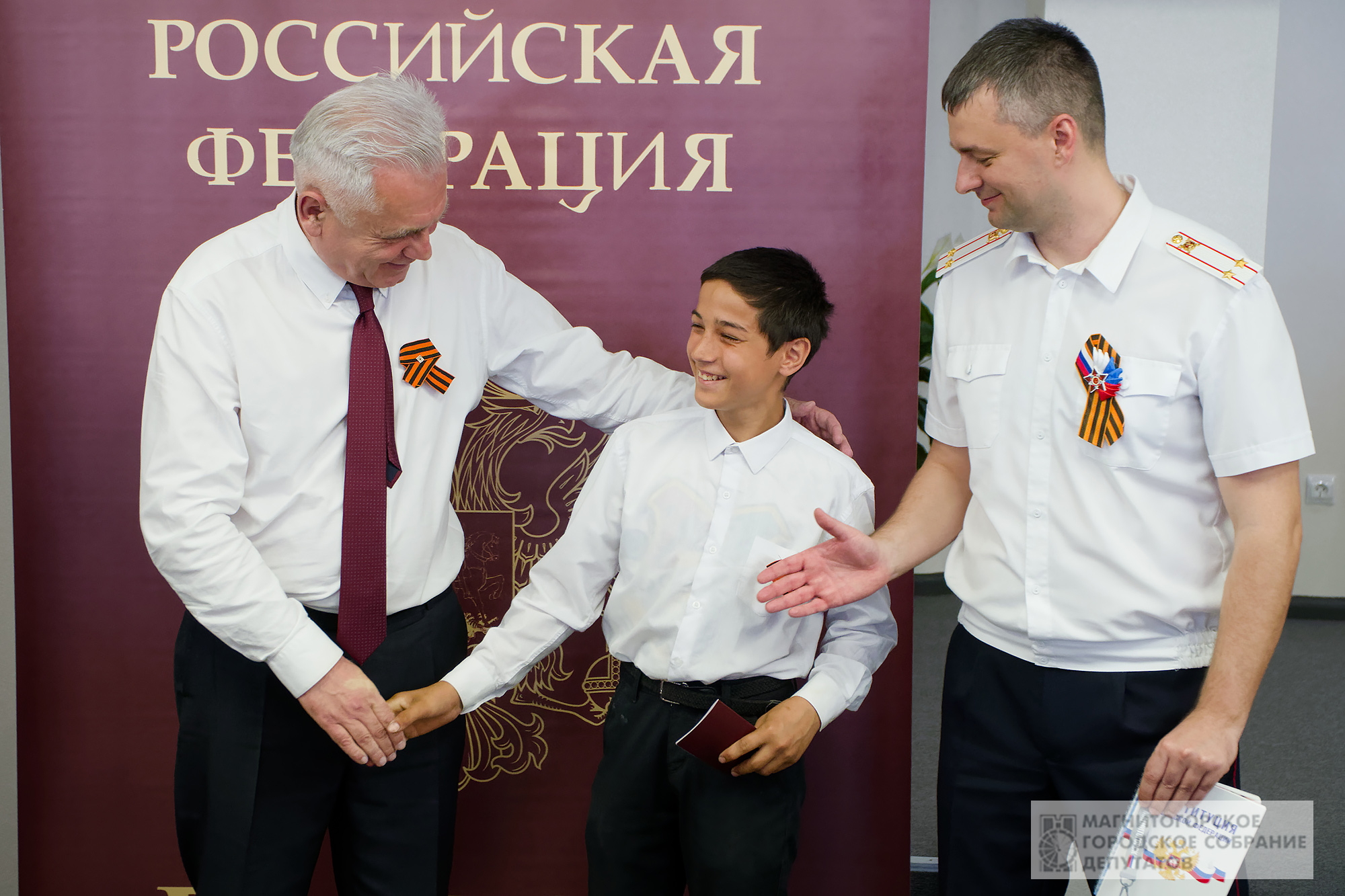 И вот тот момент – ребята под аплодисменты выходят к Александру Морозову и Сергею Шевяхову, жмут руку и, конечно же, делают фото на память, теперь уже с паспортом.