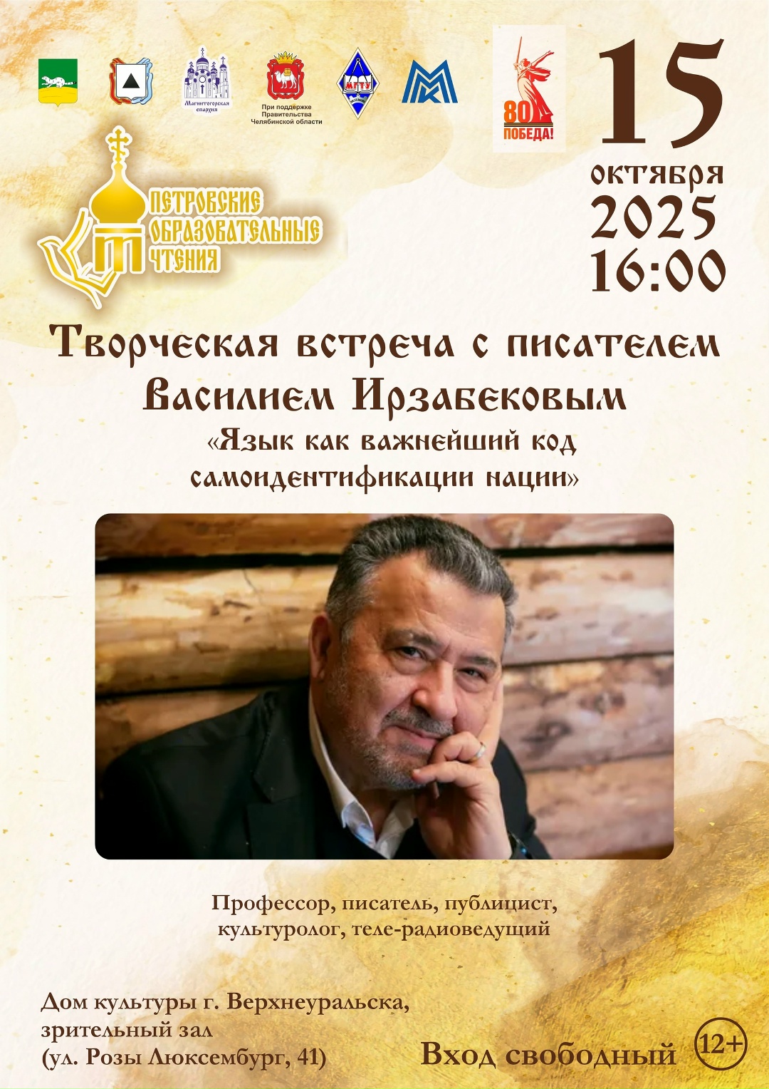 На тему: «Язык как важнейший код самоидентификации нации» с Василием Ирзабековым можно будет поговорить 15 октября в 16:00 в Доме культуры г. Верхнеуральска (ул. Розы Люксембург, 41).