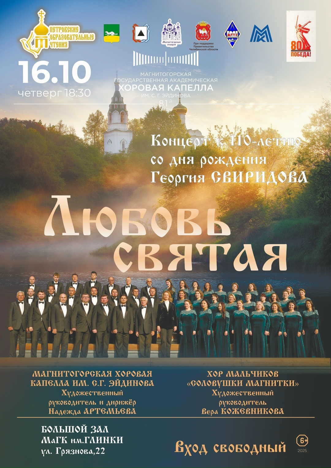 - Концерт «Любовь святая». Выступление Магнитогорской государственной академической хоровой капеллы им. С. Г. Эйдинова состоится в большом зале Магнитогорской государственной консерватории (академии) им. М. И. Глинки (ул. Грязнова, 22) 16 октября в 18:30. Концерт «Любовь святая» приурочен также к 110-летию со дня рождения Г. В. Свиридова. Помимо основного состава капеллы, зрители услышат и хор мальчиков «Соловушки Магнитки».