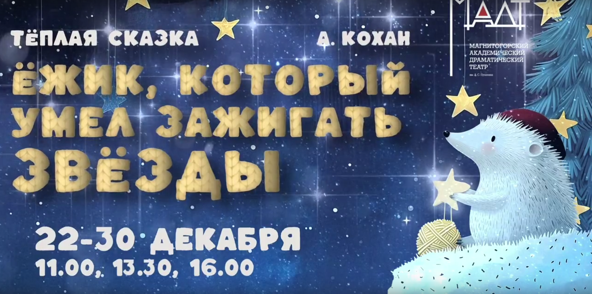 В Магнитогорском академическом драматическом театре им. А.С. Пушкина юных зрителей ожидает добрая сказка «Ежик, который умел зажигать звезды». Это трогательная история о Ежике и Медвежонке, чья теплая дружба способна зажечь на небе самые яркие звезды.