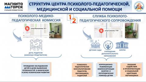 В Магнитогорске более 23 года работает Центр психолого-педагогической, медицинской и социальной помощи. Деятельность организована во взаимодействии с городскими управлениями образования, социальной защиты населения, центром по координации деятельности медицинских организаций Челябинской области, областным центром диагностики и консультирования, МВД РФ по городу Магнитогорску.