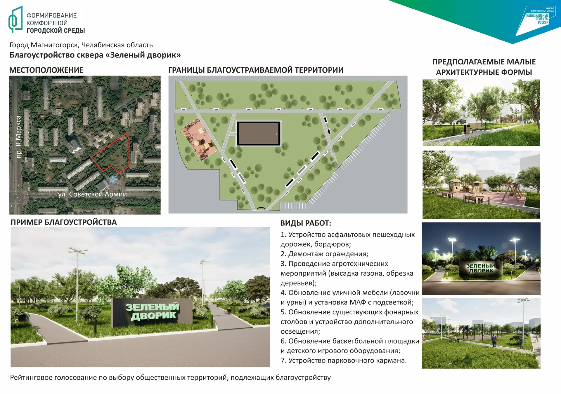 Пожелания жителей нашли отражение в дизайн-проекте благоустройства. Территория, в случае победы в рейтинговом голосовании, получит новое асфальтовое покрытие для пешеходных дорожек с бордюрным камнем. Запланирован демонтаж старого ограждения и масштабные агротехнические работы, включающие высадку свежего газона, кустарников и деревьев с сохранением хвойных пород. Обновятся лавочки и урны, появятся малые архитектурные формы с подсветкой. Существующие фонарные столбы будут модернизированы, а также добавится дополнительное освещение для безопасности в вечернее время. Для активного отдыха горожан планируется обновление баскетбольной площадки и установка современного игрового оборудования для детей. В целях решения вопроса с парковкой транспорта предусмотрено устройство парковочного кармана.