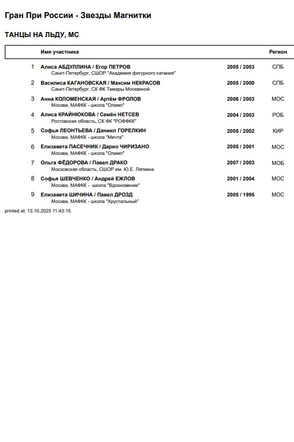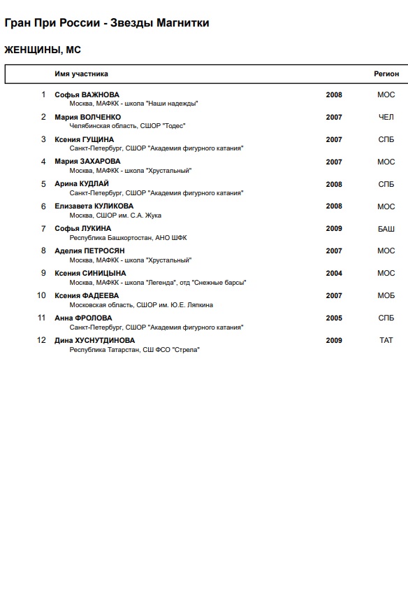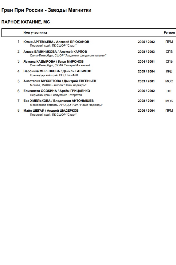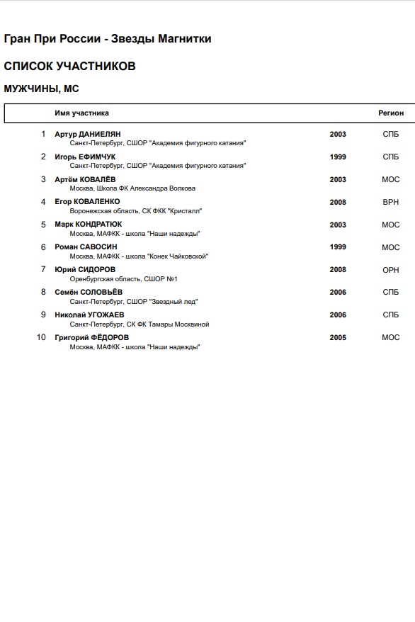 Уже стал известен и предварительный список участников соревнований. Главной звездой турнира станет двукратная чемпионка России Аделия Петросян. Спортсменка недавно завоевала путевку на Олимпийские игры и большая интрига, покажет ли Аделия в Магнитогорске программу, с которой выступит в феврале 2026 года в Милане. В мужском турнире главным фаворитом считается Марк Кондратюк – бронзовый призёр Олимпийских игр в командных соревнованиях, чемпион Европы и России. Также ожидаются выступления сильнейших танцевальных дуэтов: Василисы Кагановской и Максима Некрасова, а также Софьи Леонтьевой и Даниила Горелкина.