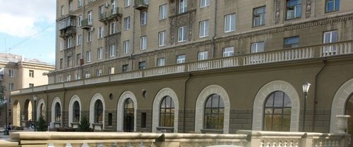 Из исторической справки: До начала пятидесятых годов прошлого века на месте проспекта Металлургов был достаточно большой овраг, а за ним – бескрайняя степь с колышущимся на ветру разнотравьем. Потом овраг сравняли в ноль, засыпав тысячами тонн скальной породы. Застройка проспекта Металлургов осуществлялась в 1952-56 годах по проекту московских архитекторов Л. Бумажного, Д. Бурдина, Л. Баталова, А. Ершова, О. Окунева. Это парадный ансамбль, в основу архитектуры которого положена пластика больших объемов зданий и их силуэтная выразительность.