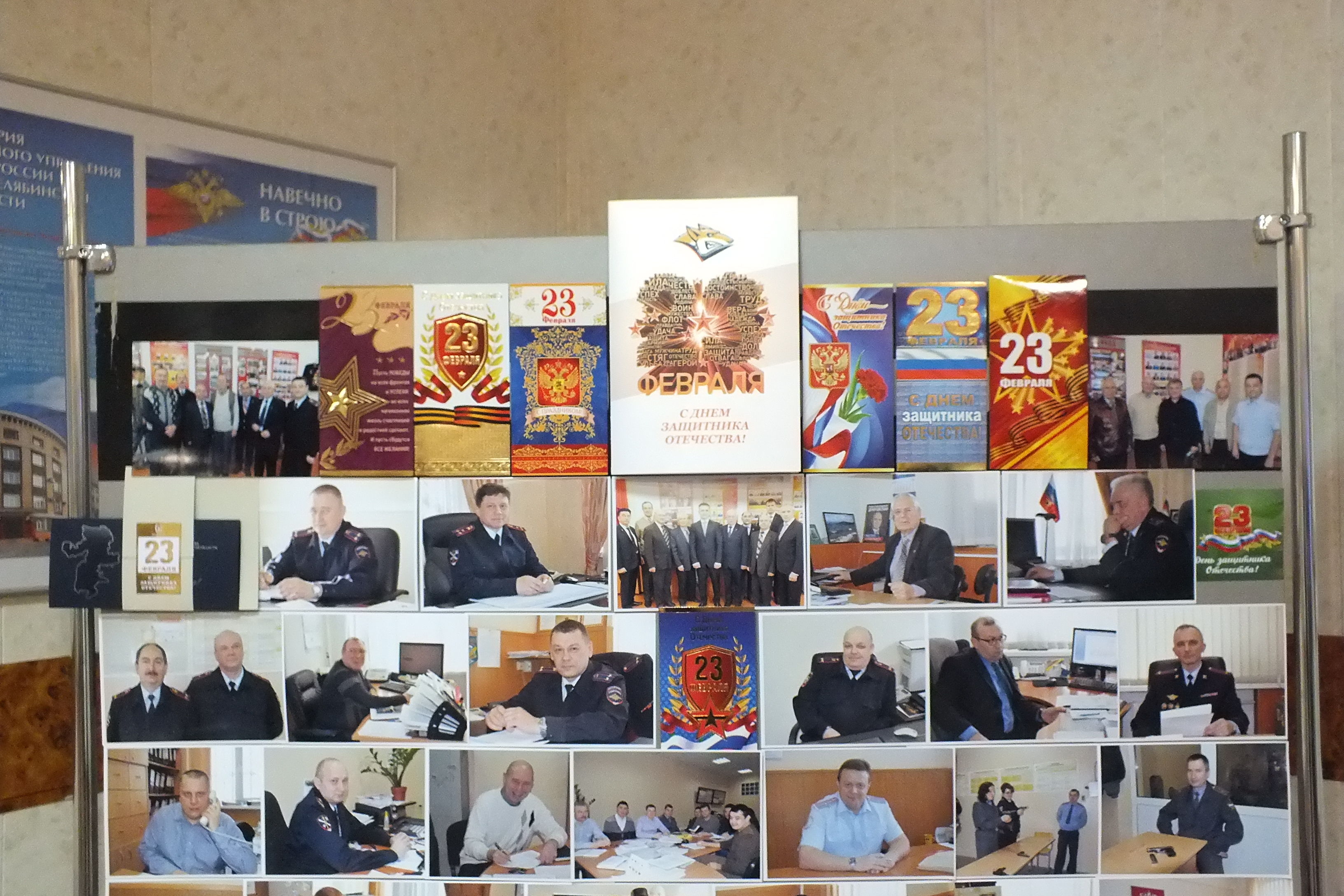 В Управления МВД России по городу Магнитогорску состоялось праздничное мероприятие, посвященное Дню защитника Отечества. В течение нескольких недель сотрудники отделения морально-психологического обеспечения готовили стенд с фотографиями действующих сотрудников – мужчин и приятными поздравлениями для коллег.