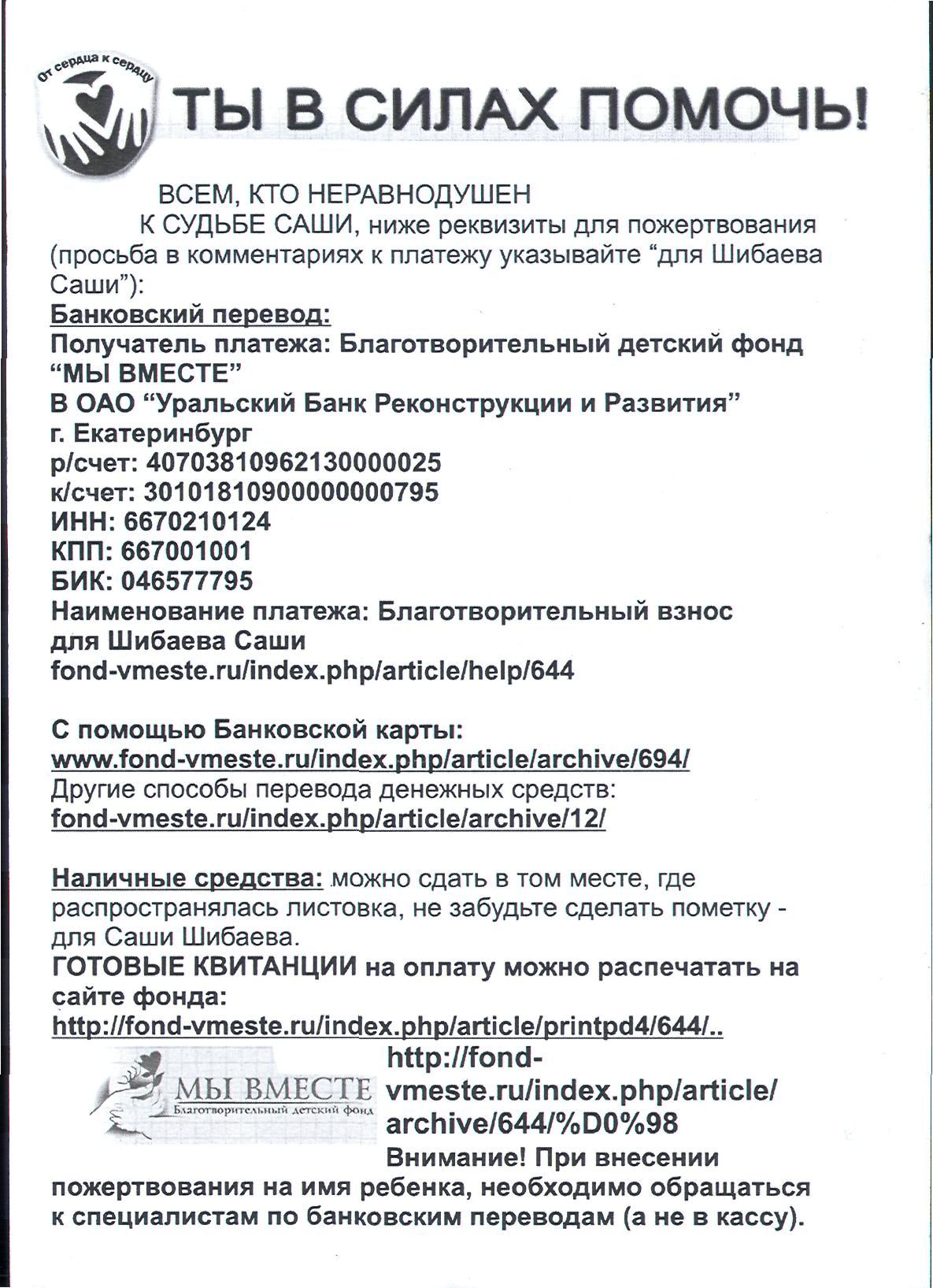 Призываем горожан принять участие в акте милосердия, помочь мальчику, который упорно борется с недугом, одолеть болезнь! Средства для Саши можно вручить волонтерам во всех кафе «Кофе-хаус» и «Баскин Роббинс». Акция в Магнитогорске продлится до 31 октября. Средства можно перечислить и в АДРЕС фонда «Мы вместе».