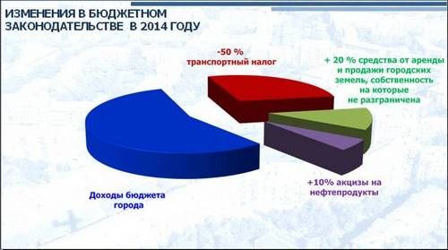 В 2014 году бюджет города не получит из областного бюджета 10% норматива по транспортному налогу. В денежном выражении город недополучит примерно 135 млн. рублей. В то же время в качестве дополнительных доходных источников бюджета со следующего года установлены: 10% от акцизов на нефтепродукты, которые будут направляться на формирование муниципального дорожного фонда; 100% средств от аренды и продажи городских земель, собственность на которые не разграничена, против 80% в текущем году.