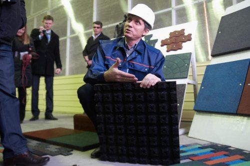 После разрезания красной ленты гостям продемонстрировали возможности линии, а также процесс изготовления бесшовного покрытия. Тут же можно было увидеть варианты плитки, разные по цвету, форме, толщине и фактуре. Недостатка в сырье предприятие не испытывает, так как единственное в городе принимает на утилизацию автошины и покрышки.