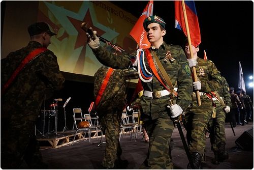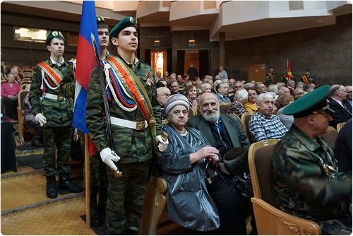 В зале собрались ветераны, те, кто в разное время и в разных концах Земли самоотверженно отстаивал интересы России. Торжественно знамённая группа внесла копию Знамени Победы, флаги бывшего СССР, России, Челябинской области и Магнитогорска.