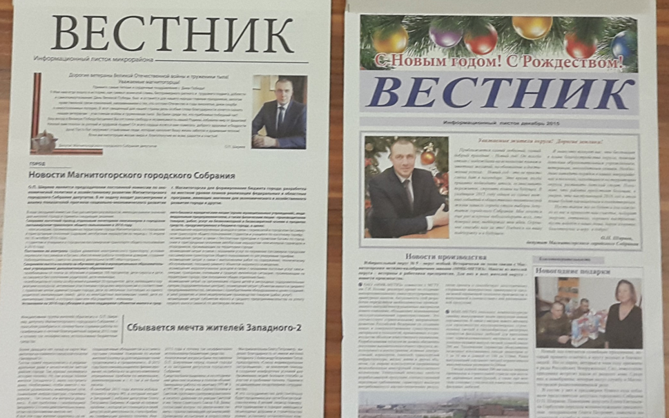 Ежегодно из средств депутата подписываются на газету “Магнитогорский Металл” более 350 человек – ветераны труда ММК и ММЗ. Ежеквартально издается “Вестник”, который является информационным листком микрорайона о жизни и делах в 9 избирательном округе.
