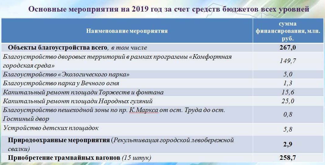 Продолжится благоустройство города в рамках программы «Комфортная городская среда». Кроме того, работы будут вестись в Экопарке, в парке у Вечного огня, на площади Торжеств и на других объектах. Еще среди мероприятий - приобретение новых трамвайных вагонов и рекультивация городской левобережной свалки.
