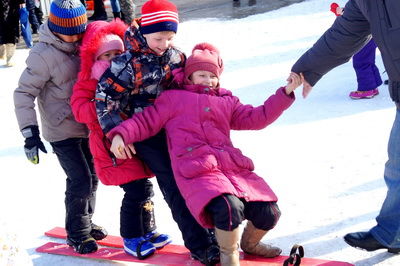 Нашлось дело и для пап: двое из них по сигналу энергичных ведущих вступили в борьбу, кто первым лопнет шарик соперника, привязанный к ноге. Традиционные масленичные развлечения - песни и игры - чередовались, не давая гостям праздника замерзнуть или заскучать.