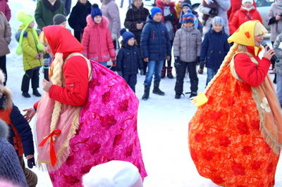 По русской традиции Масленица была с размахом. Гостей щедро угощали, как и положено, блинами, наливали горячий чай. Дети весело проводили время за играми, прыжками через веревочку, водили хороводы и пели задорные песни вместе с ансамблем "Марьюшка". Скоморохи развлекали ребят играми с гигантским валенком.