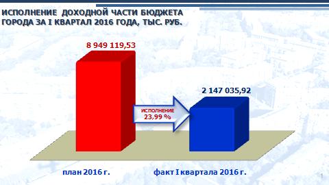 С начала года в бюджет города поступили доходы в сумме 2,15 млрд. рублей, годовые бюджетные назначения исполнены на 24%. В сравнении с соответствующим периодом 2015 года поступления налоговых и неналоговых  доходов уменьшилось  на 6,7% или на 58,5 млн. рублей. Определяющим фактором снижения является уменьшение доходов от использования и продажи имущества, находящегося в государственной и  муниципальной собственности.