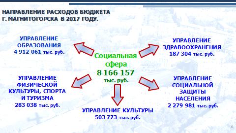 Расходы бюждета города на 2017 год запланированы в сумме 10,3 млрд. рублей. Городской бюджет традиционно социально ориентирован. Расходы на образование, социальную защиту, здравоохранение, культуру и спорт составляют 79 % от всего объема бюджетных трат. В следующем году по разделу управления образования запланировано расходов на сумму 4,9 млрд. рублей. Это на 17 млн. рублей больше ожидаемых к исполнению сумм на конец 2016 года. По разделу управления культуры также есть рост по сравнению с итоговыми данными уходящего года: исполнение планируется на сумму 485,4 млн.рублей, в бюджет 2017 года закладывается сумма в размере 503,8 млн.рублей. На физкультуру, спорт и туризм в бюджете следующего года предусмотрено 283 млн.рублей. Это на 60 млн. рублей больше первоначально утвержденных лимитов в 2016 году, но более чем на 400 млн. рублей меньше ожидаемых итоговых расходов управления 2016 года. На социальную защиту планируется израсходовать 2,3 млрд.рублей. Это на 150 млн.рублей меньше ожидаемых итогов показателей в бюджет 2016 года, но в тоже время на 58 млн. рублей больше утвержденного бюджета города на начало 2016 года. По разделу управления капитального строительства и благоустройства в бюджет следующего года закладывается сумма в размере 507 млн.рублей. Она значительно выше первоначальной цифры в бюджете 2016 года, но на 288 млн. меньше суммы, ожидаемой к исполнению в уходящем году.