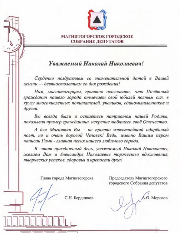Глава города Сергей Бердников и председатель городского Собрания Александр Морозов направили юбиляру поздравительный адрес с выражением искренней признательности и пожеланиями творческих успехов.