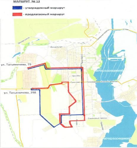 Маршрут №13: ул. Татьяничевой, 79 – ул. Гагарина - пр. К. Маркса – ул. 50 лет Магнитки – ул. Советская – ул. Зелёный лог – ул. Тевосяна – ул. Труда – ул. Советская – ул. Оранжерейная – ул. Лесопарковая – ул. Зелёная – ул. Татьяничевой, 298.