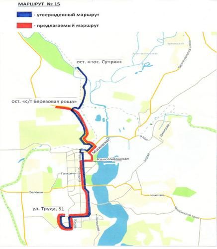 Маршрут №15: ул. Труда, 51 – ул. Тевосяна – ул. Зелёный лог – ул. Советская – ул. Труда – пр. Ленина – ул. Комсомольская – ул. Н. Шишки – ул. Московская – шоссе Белорецкое – садовое товарищество «Берёзовая роща».