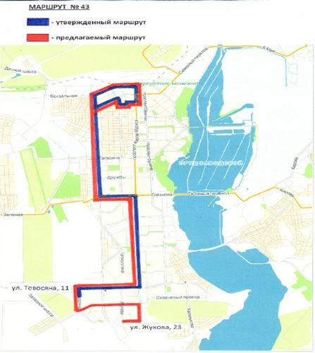 Маршрут №43: ул. Жукова, 23 – ул. Зелёный лог – пр. К. Маркса – ул. 50 лет Магнитки – ул.Тевосяна – ул. Труда – пр. К. Маркса – ул. Грязнова – ул. Советская – ул. Вокзальная – пр. К. Маркса – ул. Первомайская – ул. Герцена – ул. Суворова – ул. Московская – ул. Советская – ул. Грязнова – пр. К. Маркса – ул. Труда – ул. Тевосяна – ул. 50 лет Магнитки – пр. К. Маркса – ул. Зелёный лог – ул. Жукова.