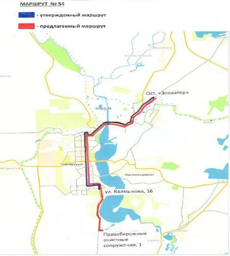 Маршрут №54: ост. «ВКХ» (район очистных сооружений)– ул. Калмыкова – ул. Труда – пр. К. Маркса – ул. Вокзальная – пр. Ленина – ул. Московская – Северный переход – ул. Бахметьева – ост. «Элеватор».