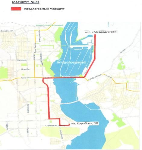 Маршрут №69: ул. Коробова,18 – проезд Сиреневый – ул. Калмыкова – ул. Труда – пр. Ленина – ул. Грязнова – Южный переход – ост. Металлургов (5 проходная).