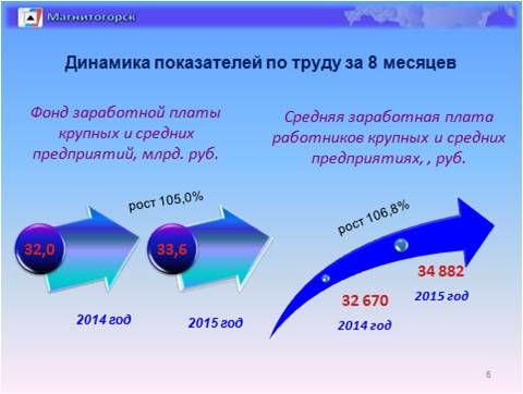 Средняя заработная плата работников крупных и средних предприятий города составила 34 882 рубля в месяц. На ОАО «ММК» средняя зарплата - 51 694 руб. в месяц. В малом бизнесе - 23 250 руб. в месяц.