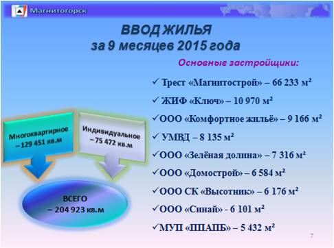 Введено в эксплуатацию 205 тыс.кв.м. жилья, в том числе многоквартирное жильё – 129,5 тыс.кв.м., индивидуальное – 75,5 тыс.кв.м. Продолжается расселение ветхо-аварийного жилфонда. В 2015 году Магнитогорску выделены средства для расселения 85 семей из 10 многоквартирных аварийных домов. Кроме того, планируется переселение жителей аварийного дома № 20 по ул. Московская. В 2016 году нужно расселить жителей ещё 21 дома, где проживают 225 семей.
