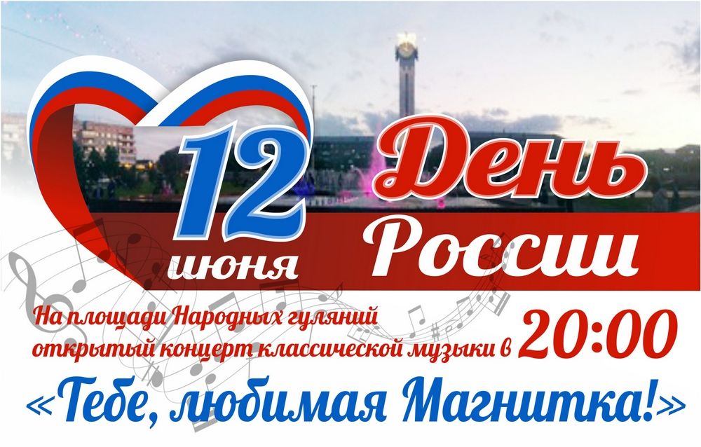 А в 20:00 на площади Народных гуляний начнется открытый праздничный концерт классической музыки «Тебе, любимая Магнитка!», который вот уже в четвертый раз порадует любителей высокого искусства. Мероприятие по традиции организовывает управление культуры администрации города, театр оперы и балета и Магнитогорское концертное объединение. Концерт направлен на популяризацию лучших образцов русской музыкальной классики и станет своеобразным подарком музыкантов горожанам к главному государственному празднику.