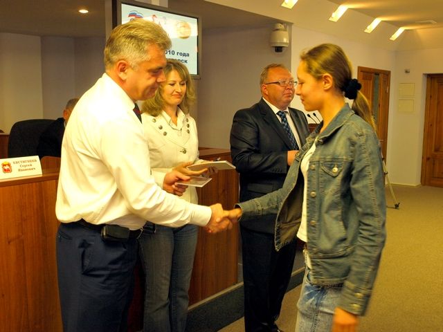Добрые напутственные слова в адрес ребят прозвучали от депутата ЗСО Сергея Евстигнеева, депутата МГСД Андрея Старкова. В подарок дети получили блокноты и ручки с символикой городской власти и билеты в кинотеатр. А общая фотография на память сохранит этот волнительный для каждого момент в семейной истории.