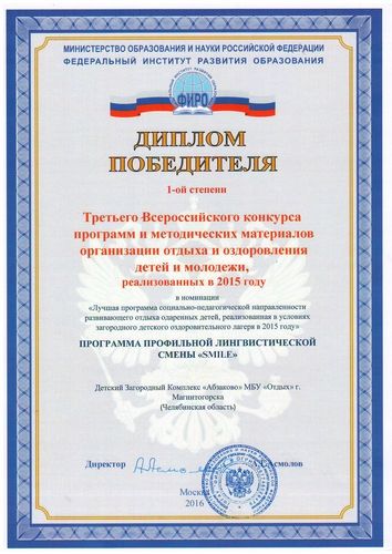По результатам III Всероссийского конкурса программ и методических материалов организации отдыха и оздоровления детей и молодежи Магнитогорское бюджетное учреждение «Отдых» удостоено Диплома I степени за проведение в 2015 году лингвистической смены «Smile» на базе детского загородного комплекса «Абзаково».