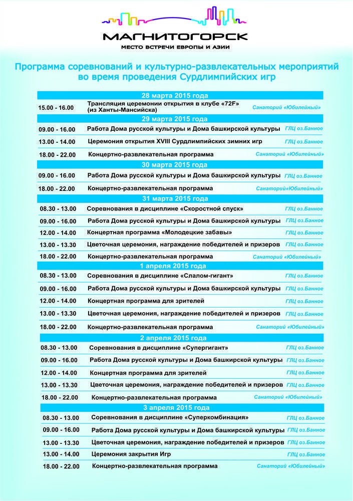 Для участия в Магнитогорских стартах XVIII Сурдлимпийских зимних игр приедут 84 спортсмена и 120 сопровождающих. Проживать они будут в санатории «Юбилейный». Наш город на Играх в составе сборной России будут представлять горнолыжники Илья Иванов и Руслан Шайхутдинов.