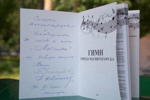 bukl4-smУчастники конкурса на лучший проект гимна Магнитогорска не остались незамеченными. На празднике, посвященном Дню города, все конкурсанты получили буклеты с текстами самых удачных вариантов песен с автографами А. Пахмутовой и Н. Добронравова.