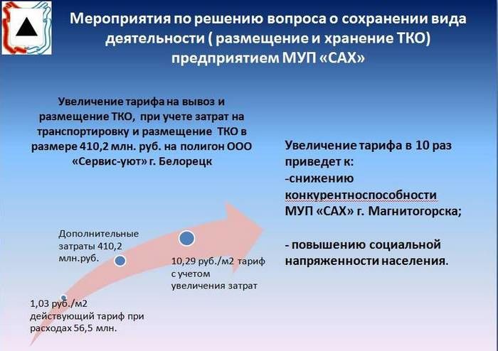 МУП «Спецавтохозяйство» осуществляет два основных вида деятельности: размещение твердых бытовых отходов на свалке и их транспортировка. В настоящее время, размещение ТБО на свалке не отвечает требованиям законодательства. Для этого необходим специальный полигон. Природоохранная прокуратура дважды выносила постановления о наложении административных наказаний за несоблюдение законодательства в сфере хранения твердых бытовых отходов. Таким образом, складировать отходы на магнитогорской свалке «Спецавтохозяйство» не имеет права.