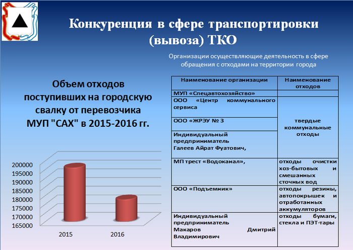 Помимо этого, отмечено, что в городе работают два крупных перевозчика ТБО. Это ООО «ЖРЭУ -3» и ООО «Центр коммунального сервиса», которые в последнее время значительно активизировали свою деятельность по привлечению новых клиентов. МУПу выдерживать ценовую конкуренцию стало практически невозможно. В апреле от услуг «Спецавтохозяйства» отказались 117 контрагентов, еще 140 договоров будет расторгнуто в начале мая. В случае продолжения деятельности предприятия ущерб только за второй квартал текущего года превысит 700 тыс. рублей.