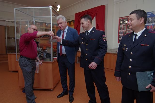 Также процветания Музею пожелал директор городского краеведческого музея Александр Александрович Иванов и передал в дар музею старинный чугунный утюг, которым возможно жены гладили милицейскую форму.