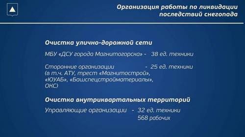 Сразу стали привлекать стороннюю технику: Теплофикации, Водоканала… всех муниципальных предприятий. К 40 единицам техники ДСУ добавилось 25 сторонней, в том числе Магнитогстроя, АТУ ММК… Управляющие компании пока что прочистили межквартальные проезды в среднем на 25%. Причина – скопление транспорта во дворах.