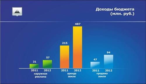 Перейдя непосредственно к деятельности властей, Евгений Тефтелев отметил, что эффективное использование земли и муниципального имущества – второй показатель наполняемости бюджета города  (после налогов). В течение года продано 457 земельных участков, в бюджет перечислено более 94 миллионов рублей. От аренды земли получено 487 миллионов рублей. От рекламной деятельности - 57 миллионов рублей. Все названные показатели выросли вдвое.