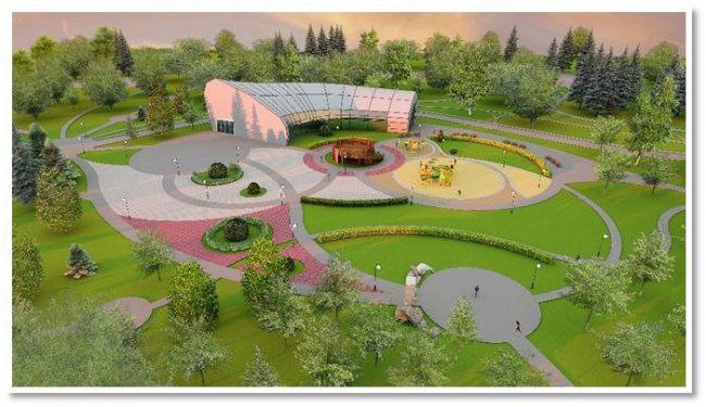 1этап: главная аллея с севера на юг: асфальтирование с бордюрным камнем, высадка елей и устройство газона, освещение аллеи. Южная часть парковой зоны: велосипедные, беговые и прогулочные дорожки (асфальт и гравий), озеленение, освещение дорожек.