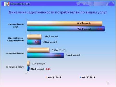 Задолженность потребителей за ЖКУ возросла на 7,8% и составила по состоянию на начало июля 2 млрд. рублей. Основным должником является население города. Долги населения перед ресурсоснабжающими организациями и управляющими компаниями составляют 65% в общем объеме задолженности.
