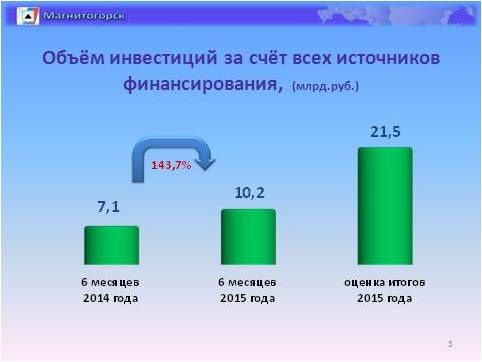 Рис4Объем инвестиций по предварительным данным составил 10 млрд. рублей, в том числе инвестиции в основной капитал предприятий Группы ММК – 6,4 млрд. рублей. По итогам года объём инвестиции ожидается в размере 21,5 млрд. руб.