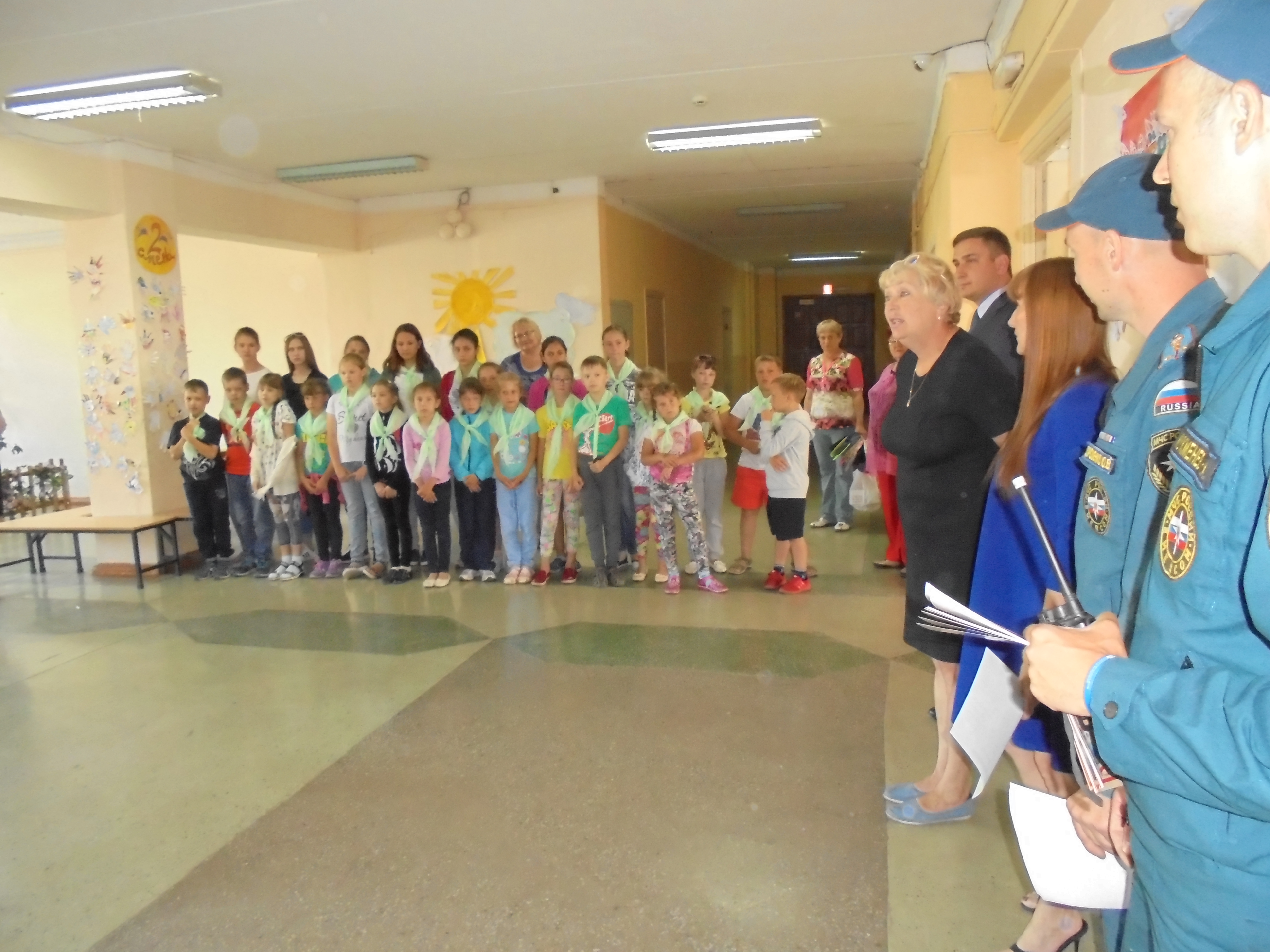 11 июля школа №67 принимала гостей. В фойе школы выстроились участники итоговой познавательной игры по ОБЖ.